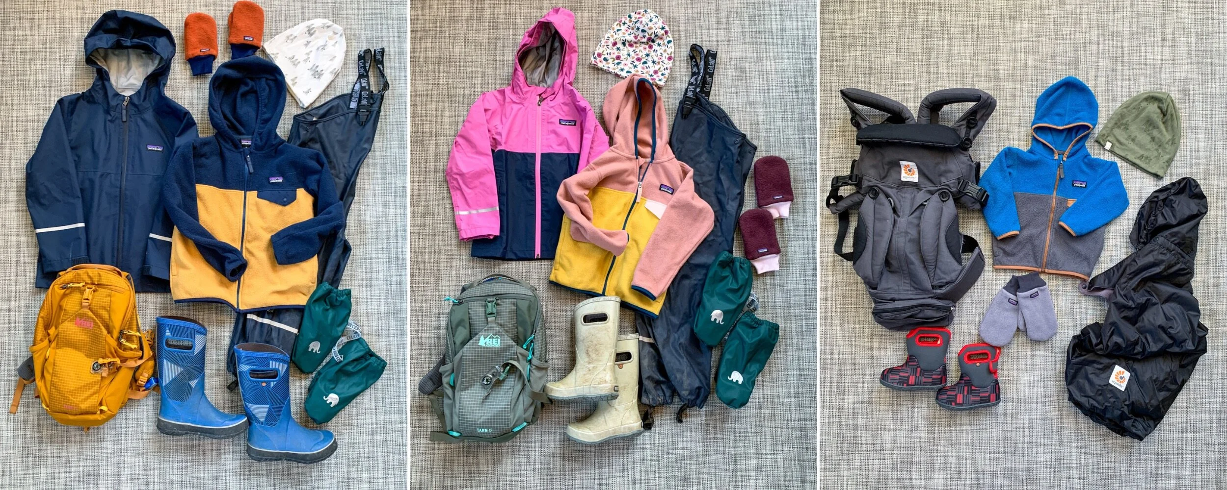 Raincoat: We use the Patagonia Torrentshell raincoats (baby/toddler and kids).
