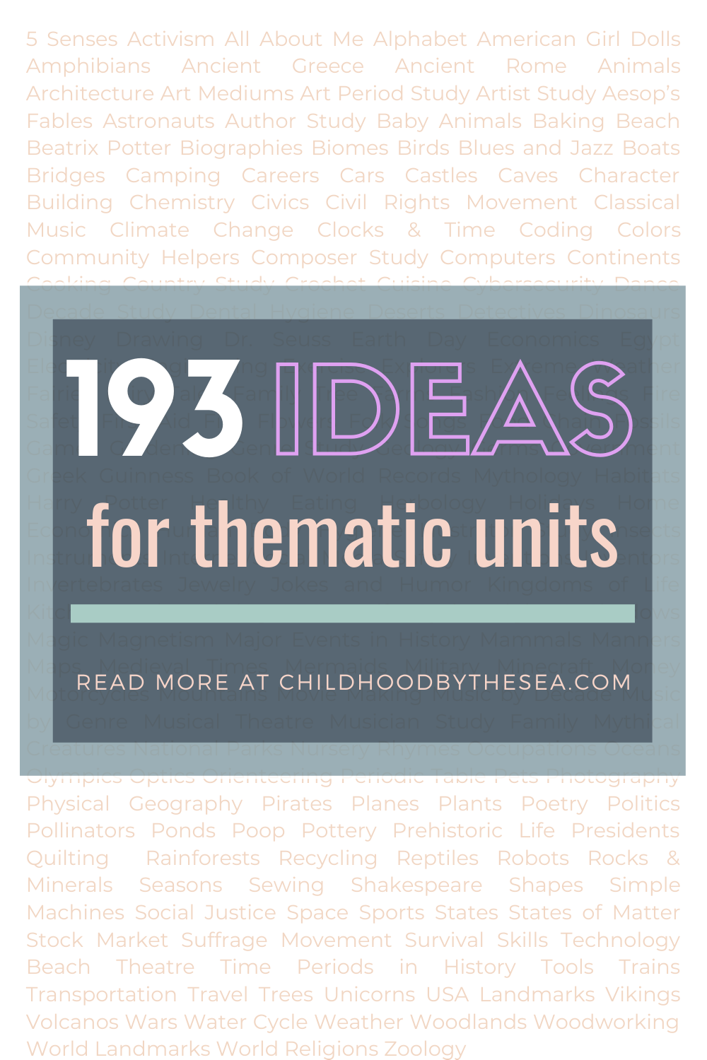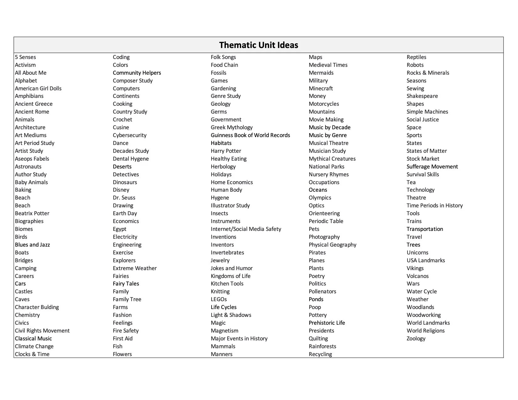 Planning a unit study begins with a topic. You can choose any topic you like, although I try to select themes that my kids and I will enjoy. Sure, you can look to your state's standards for learning to get an idea of what topics in a traditional classroom setting — but you don't need to follow the same schedule for learning as a conventional classroom. Still stuck? Here's a list of almost 200 themes to get you started: