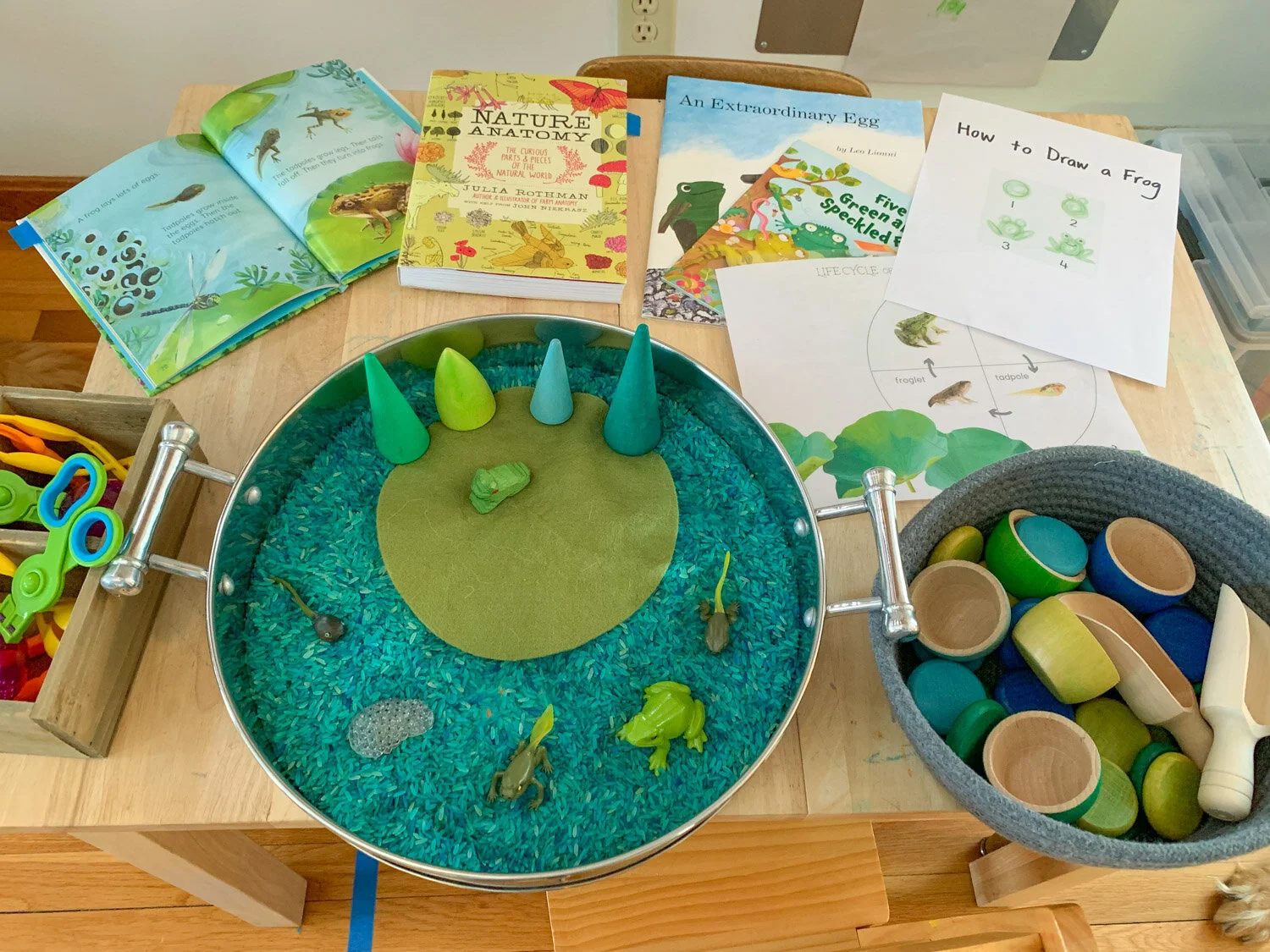 We tend to do our units for roughly 5 weeks and then take a week off before starting the next unit. We spend 15-20 minutes a day on our theme. As we work through our topics and activities, the kids document their learning by drawing/labeling/narrating their learning in their main lesson books (blank notebooks).