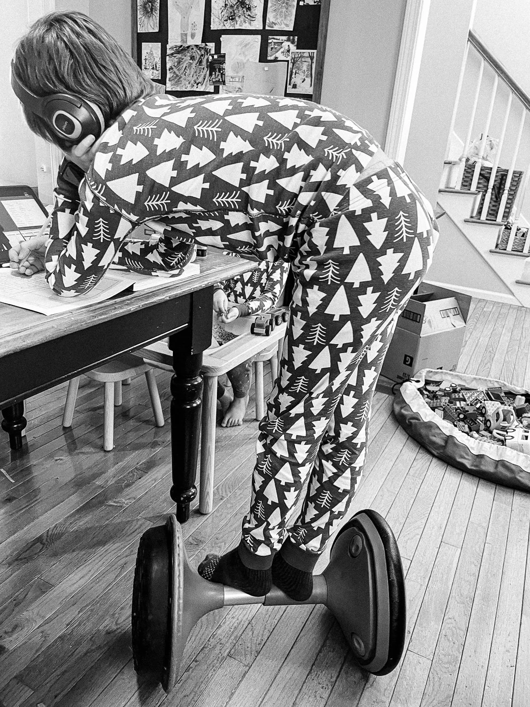 wooble stool + headphones and another child in the background with kinetic sand
